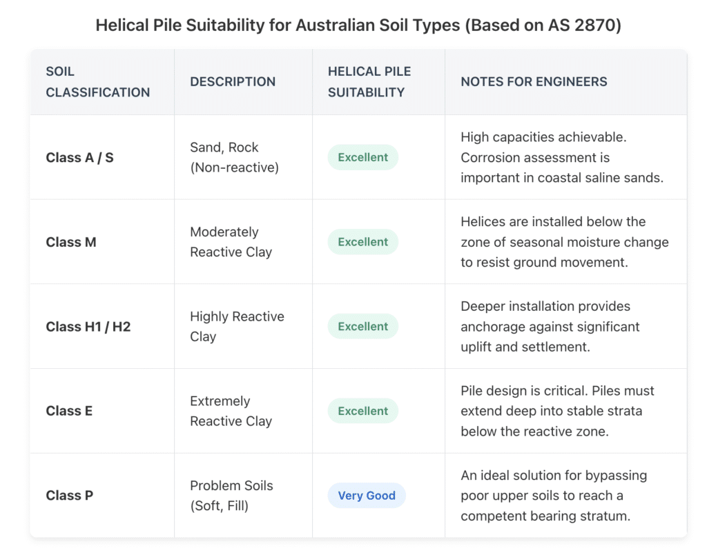 Australia’s geology is incredibly varied, from the highly reactive clays in Victoria and South Australia to the soft, sandy soils of coastal Western Australia and the hard, dry ground of the outback. Helical piles are exceptionally versatile and can be engineered for predictable performance in nearly all of these conditions.