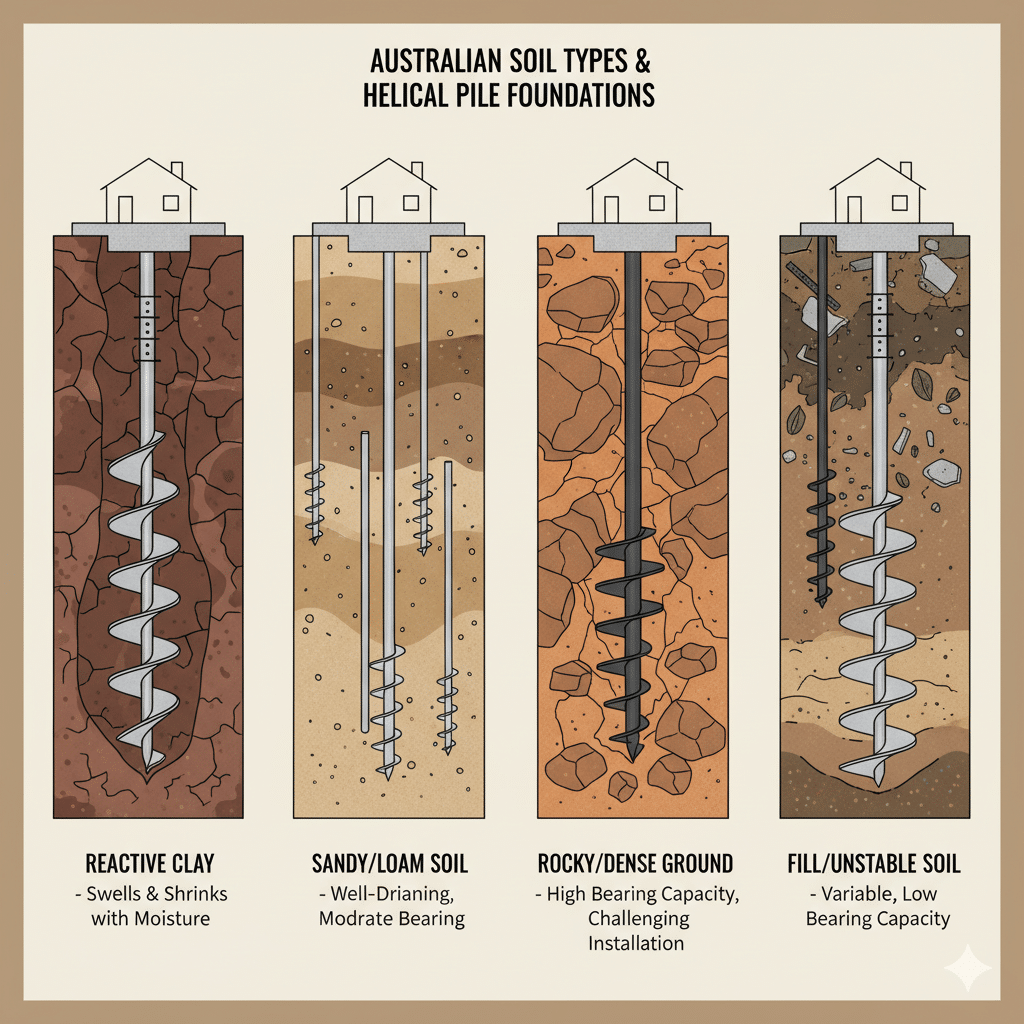 Explain how the helical design anchors the pile below the zone of seasonal moisture change, mitigating the risks of uplift and movement associated with Australia’s reactive clays. This is a significant advantage for engineers designing for long-term stability.